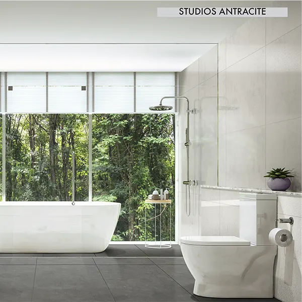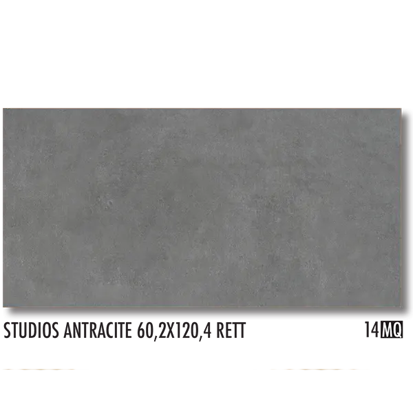Studios Antracite je gres keramička pločica, laserski rezana (retificirana) u formatu 60,2×120,4 cm s modernom imitacijom betona u tamno sivoj nijansi. Precizno rezani rubovi omogućuju fugiranje od samo 2 mm, što rezultira čistom i vizualno neprekinutom površinom.
